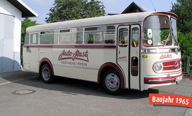 Der Mercedes OH321 nimmt Sie mit auf eine Reise zurück in die Vergangenheit – genauer gesagt in die 60er Jahre, denn gebaut wurde der Bus 1965. Dass er fünfundfünfzig Jahre später noch immer aussieht wie neu, hat er unseren aufwändigen und liebevollen Restaurationsarbeiten zu verdanken. Insgesamt achtzehn Monate lang haben wir an dem Oldtimer gefeilt, ohne seinen ursprünglichen nostalgischen Charme zu verfälschen. Genießen Sie diesen entweder im Rahmen unserer Oldtimer-Fahrten oder mieten Sie den Mercedes OH321 für eigene Veranstaltungen mit maximal 23 Personen.
